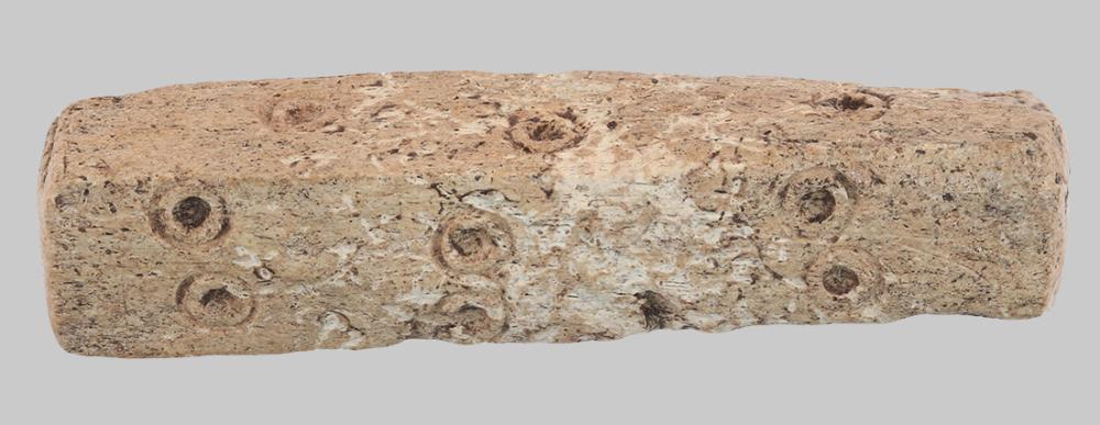 Längliche Form mit Kreisaugendekor. 3, 4, 5 und 6 Würfelaugen, wobei die Augen so angeordnet sind, dass 3 und 4 Augen, bzw. 5 und 6 Augen gegenüberliegen. Bei den 5 Würfelaugen ist das mittlere etwas versetzt.