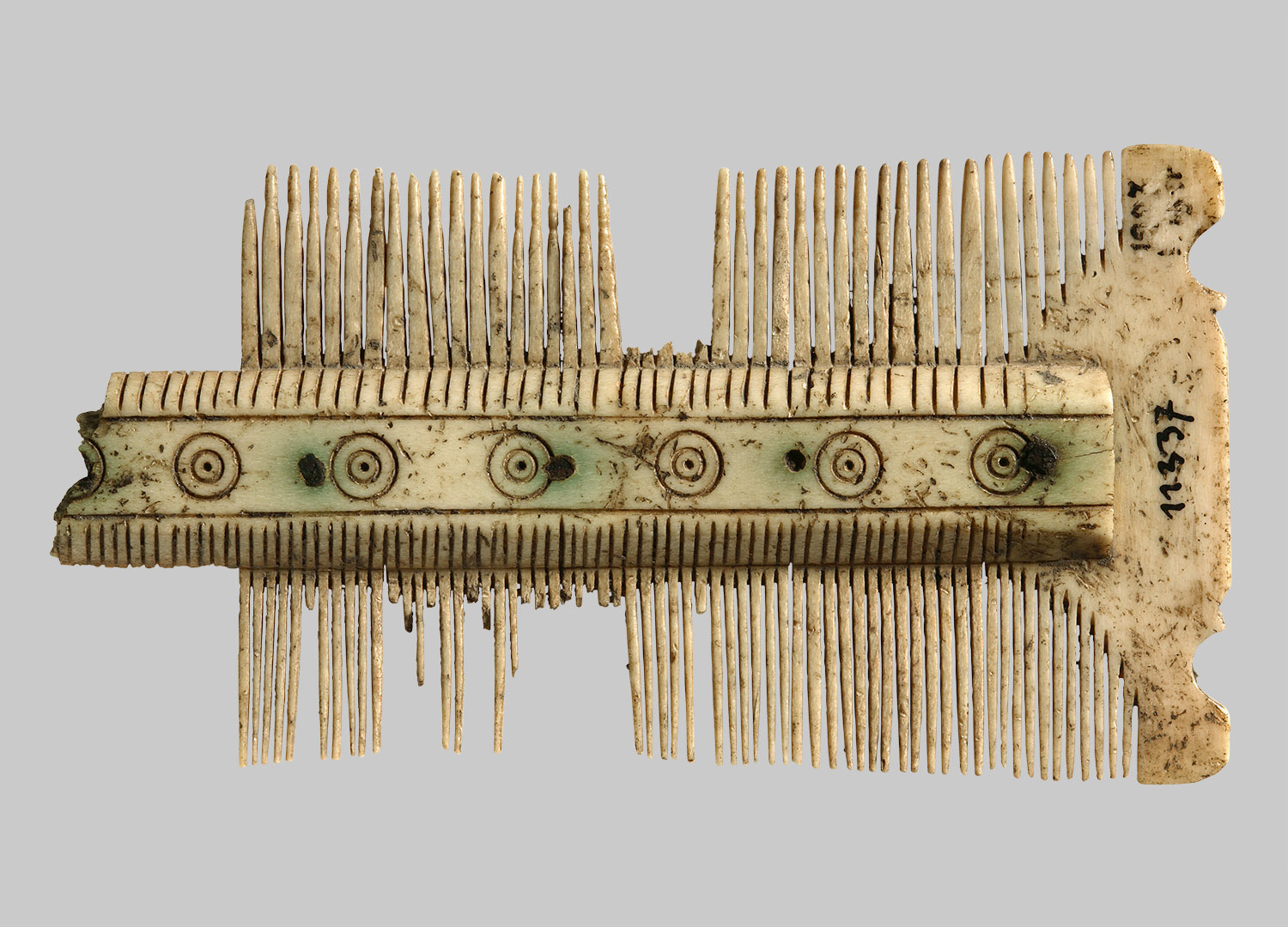 Zweizeiliger Dreilagenkamm. Eine Schmalseite der Zahnplatte profiliert, zweite Schmalseite weggebrochen. Verbindungsleiste mit Kreisaugen- und Liniendekor. Seitlich eingeritztes Leitermuster. Fünf Nieten. Zahnreihen fragmentiert.