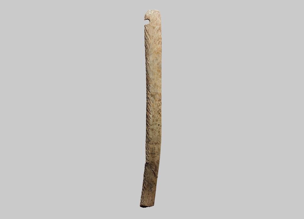 Beinerner Bestandteil eines hölzernen Reflex- oder Kompositbogens. Die Bogenendversteifung ist oben abgerundet, hat halbrunde Ausnehmung und Kerbspuren entlang einer Längsseite.