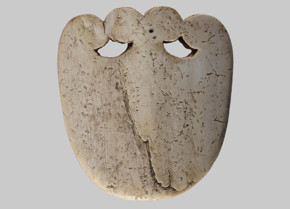 Ein Volutenortband mit zwei peltaförmigen Durchbrechungen. Es diente als unterer Abschluss der Schwertscheide.