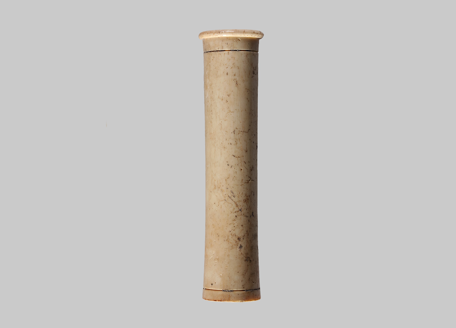 Länglicher, im Querschnitt runder Griff mit glatter Oberfläche. An beiden Enden je eine umlaufende Rille. Ein Ende weist einen Wulstrand auf. Vollständig erhalten.