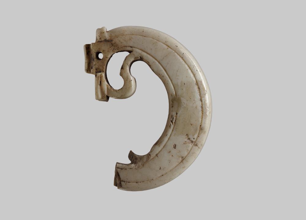 Gürtelschnalle mit D-förmigem Bügel. Die Oberseite ist mit feinen Rillen dekoriert, die Unterseite ist plan. Rudimente einer volutenförmigen Verzierung erhalten. Die Scharnieröse ist weggebrochen.