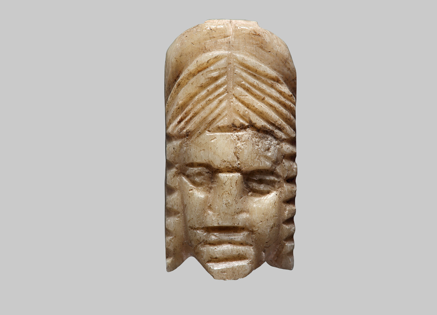 Haarnadelkopf in Form einer Maske. Die Frisur, die Augen und der Mund sind detailreich, die Nase nur grob ausgeführt. Auf der Rückseite, im Bereich des Gesichtes, zwei tiefe Kerben.