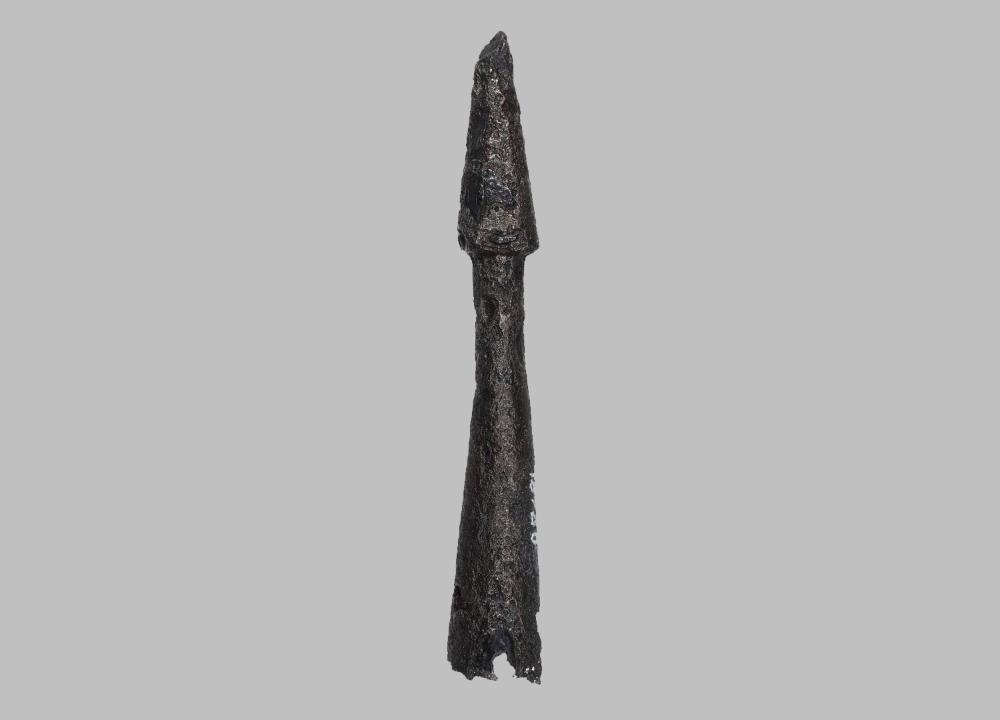 Kegelförmige Bolzenspitze mit abgesetzter, abgeflachter Spitze und mit fragmentierter, geschlossener, konischer, im Querschnitt kreisförmiger Tülle.