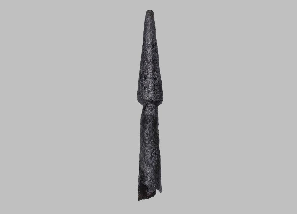 Kegelförmige Bolzenspitze mit abgesetzter, abgeflachter Spitze und mit fragmentierter, geöffneter, konischer, im Querschnitt kreisförmiger Tülle.