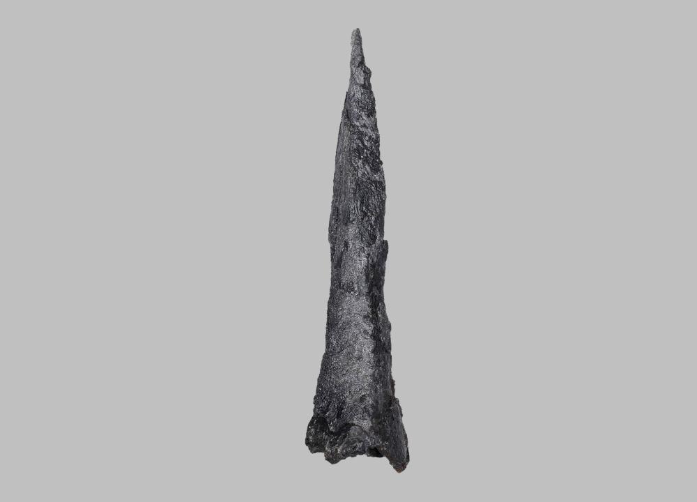 Vierkantige Bolzenspitze mit pyramidenförmiger, abgebrochener Spitze und mit fragmentierter, geschlossener, konischer, im Querschnitt kreisförmiger Tülle.