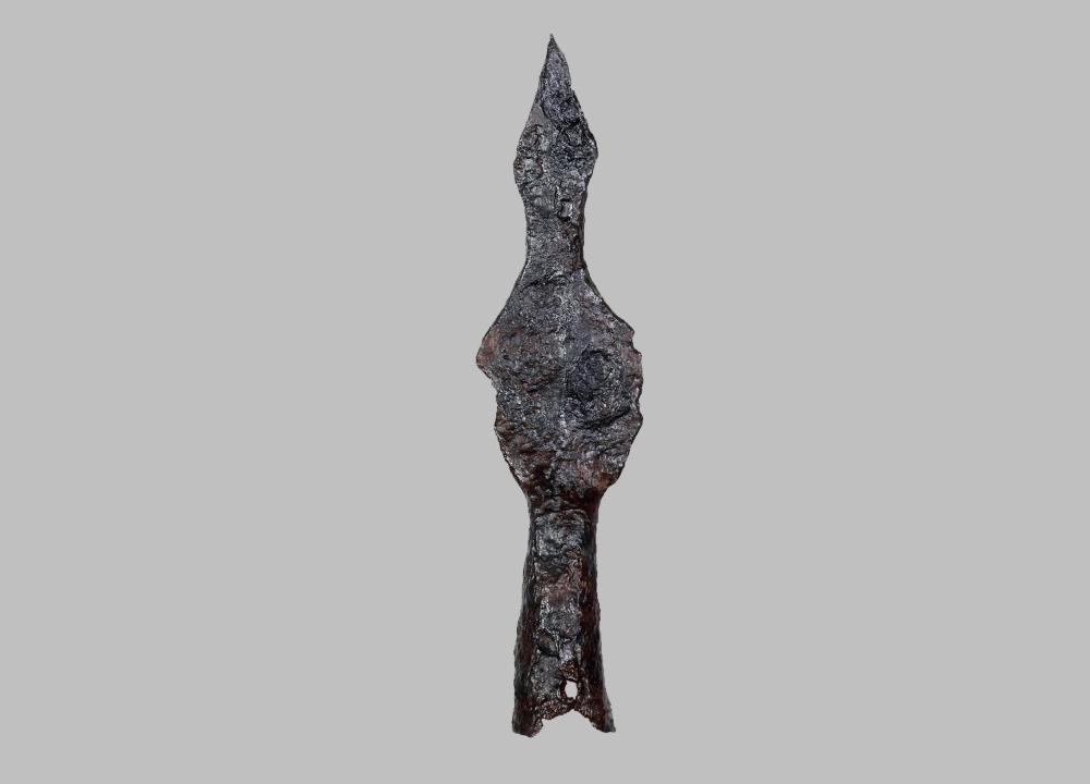 Bolzenspitze mit fragmentiertem, geigenförmigem Klingenumriss. Der Klingenquerschnitt ist bikonvex und die Spitze ist ausgezogen. Auf der fragmentierten, geöffneten, konischen Tülle mit kreisförmigem Querschnitt ist ein quadratisches Loch erhalten.