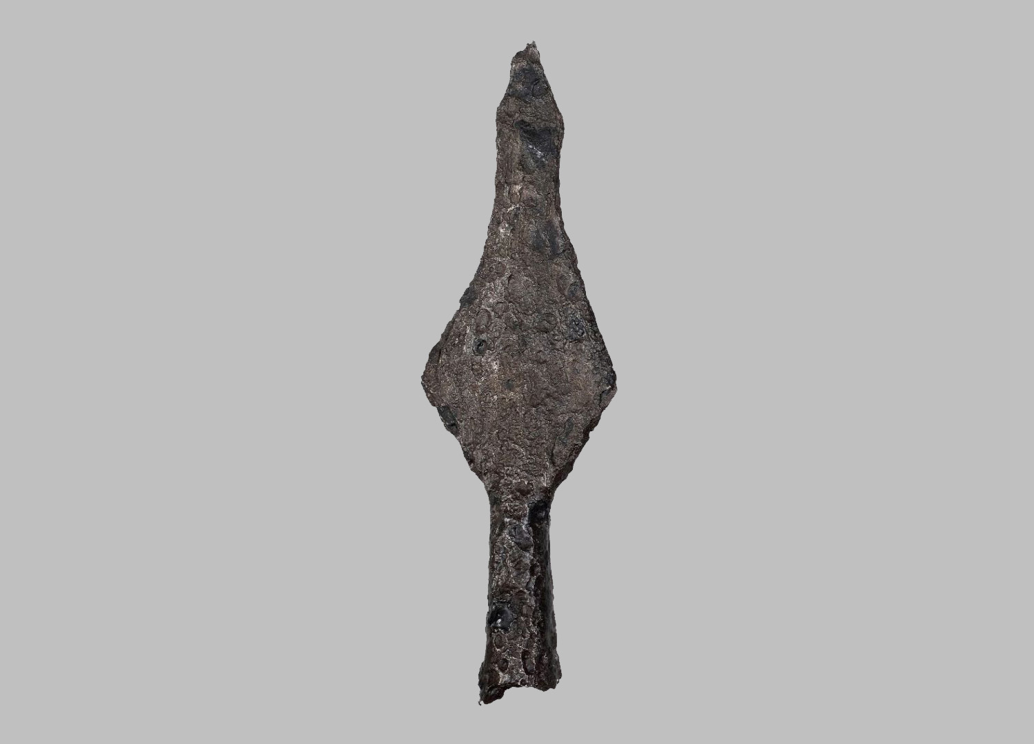 Massive Bolzenspitze mit geigenförmigem Klingenumriss. Der Klingenquerschnitt ist bikonvex und die abgebrochene Spitze ist ausgezogen. Die fragmentierte, geöffnete, konische Tülle ist im Querschnitt kreisförmig.