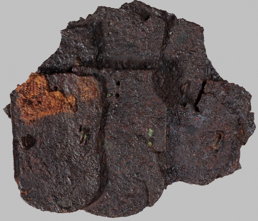 Neun miteinander verbundene, unbewegliche, unten abgerundete Schuppenpanzerfragmente mit dünnem, bronzenem Draht und Textilresten auf innerer Seite.