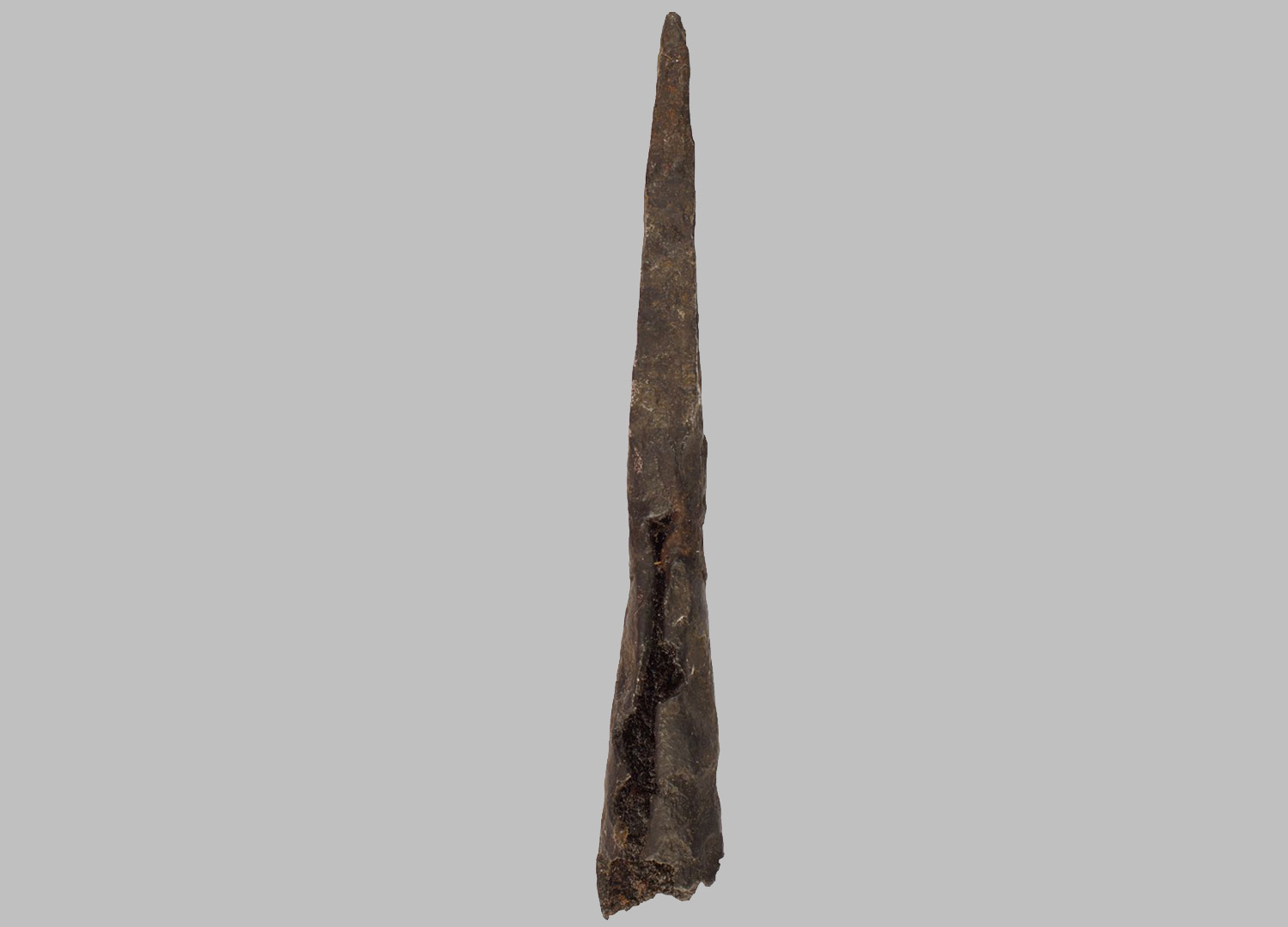 Vierkantige Bolzenspitze mit schlanker, pyramidenförmiger, abgebrochener Spitze und mit fragmentierter, geöffneter, konischer, im Querschnitt kreisförmiger Tülle.