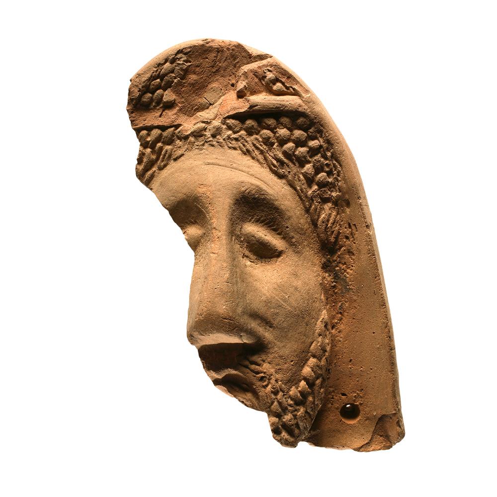 Fragment einer männlichen Maske, linke Hälfte gebrochen, Haare und Reste vom Bart erhalten, glattes Gesicht.