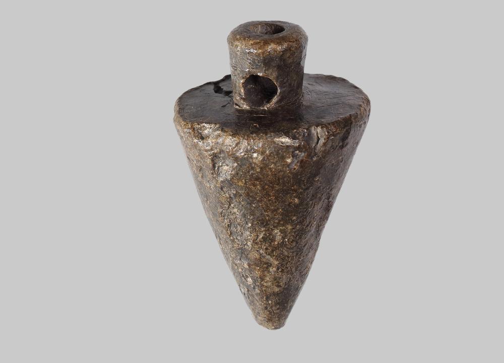 Kegelförmiger Körper mit zylindrischer, dreifach gelochter Aufhängevorrichtung oben.