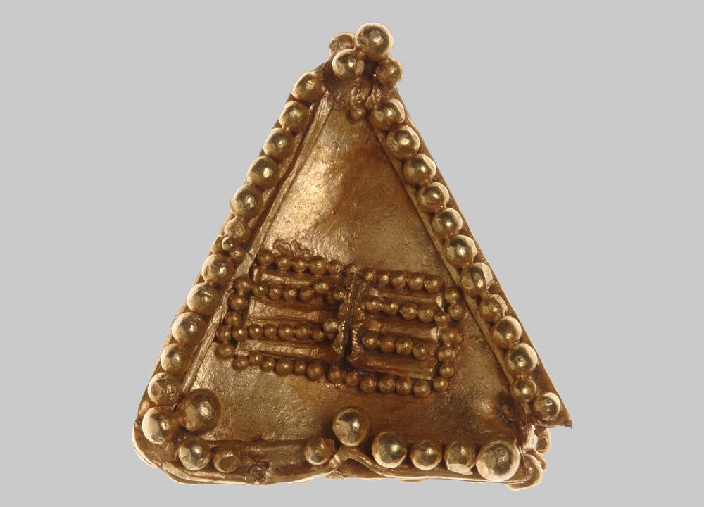 Pyramidenförmig aufgebautes Ohrgehänge aus Goldblech. Die dreieckigen Felder sind jeweils von einem bandförmigen, hochkant aufgelöteten Golddraht eingerahmt. Das Inneren der oberen drei Felder ist mit vielen kleinen, in Granulationstechnik aufgelöteten Kügelchen gefüllt. Die Kanten der Pyramide und somit den Bereich zwischen den Golddrähten zieren etwas größere aufgelötete Goldkügelchen. An der Oberseite des Anhängers wurden entlang des Randes Goldkügelchen angebracht, an den Ecken erkennt man mehrere übereinander liegende Kügelchen. Im Zentrum des oberen dreieckigen Feldes erkennt man einen rechteckigen Rahmen aus kleinen Goldkügelchen sowie darin eingeschlossen zwei weitere Reihen von Kügelchen.