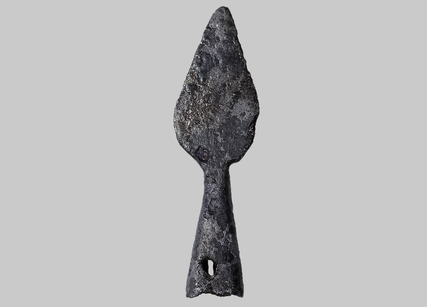 Flache Pfeilspitze mit lorbeerförmigem Blatt und mit geöffneter, konischer, im Querschnitt kreisförmiger Tülle mit kleinem, kreisförmigem Loch.