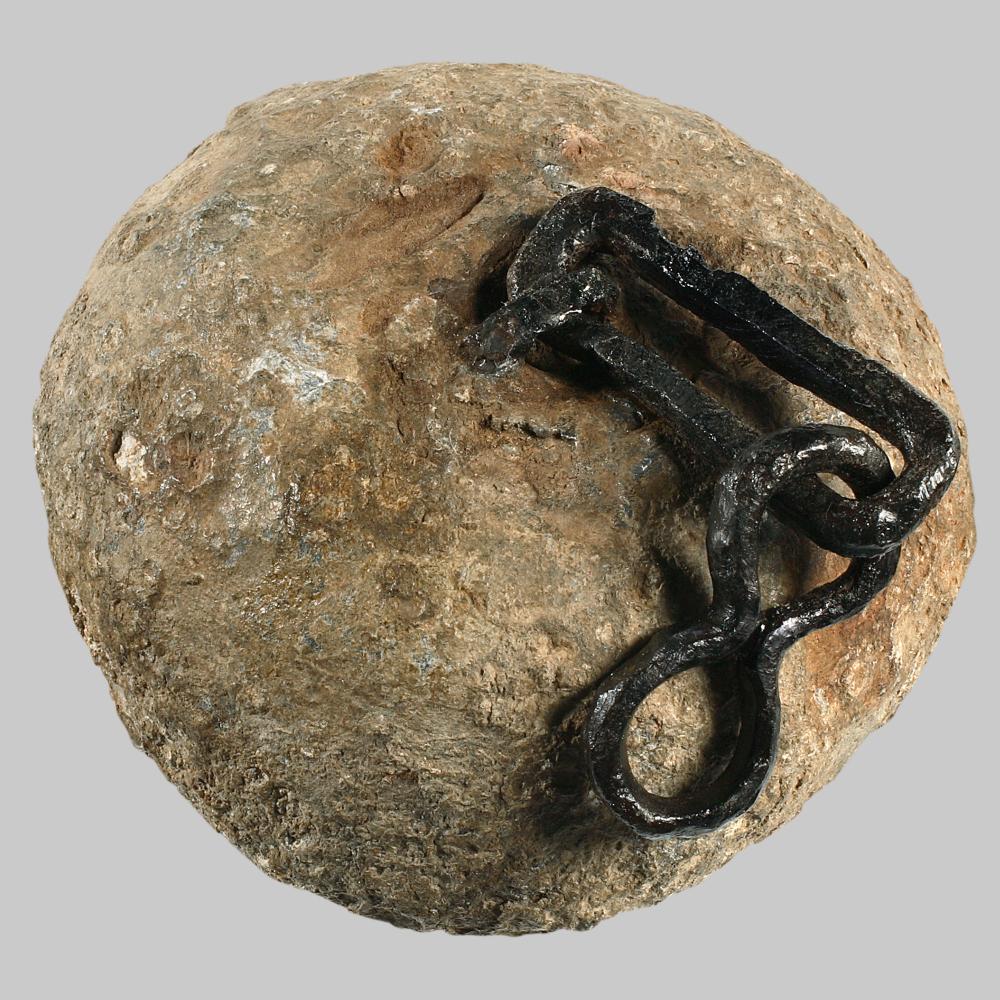 Apfelförmiger Körper aus Blei; oben Öse aus Eisen, sowie zwei weitere Eisenglieder in Spangenform und 8er-Form; auf Körperunterseite Eisenmarkierung mit Buchstaben A