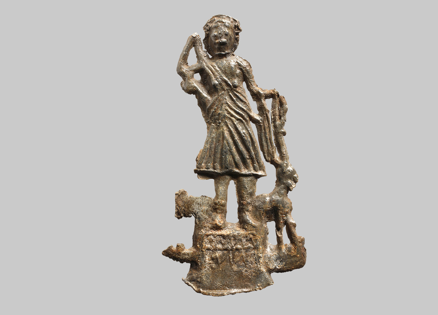 Diana frontal auf einem Podest stehend; Gesicht sehr rudimentär dargestellt mit zwei Knopfaugen und breitem Strichmund; Frisur mit zackenförmigen Erhebungen dargestellt, oben Diadem; in kurzer, gegürteter Tunika mit nackter linker Schulter und Brust, sowie Stiefel; rechte Hand greift zum Köcher hinter ihr, linke Hand auf Bogen gestützt; links und rechts der Beine zwei Hirschkühe; Podest mit doppelreihigem Zick-zack-Muster verziert, innen hohl; teilweise breite Gussnähte.