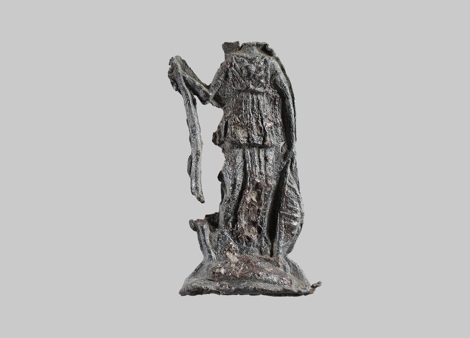 Minerva frontal im Kontrapost auf einem ovalen Podest stehend; im langem, doppelt gegürtetem Gewand mit geschuppter Ägis und Medusenkopf auf der Brust; rechter Arm angewinkelt erhoben und Lanze haltend, linke Hand hält ein auf den Boden gestelltes buckeliges Schild; Podest hohl; breite Gussnaht.