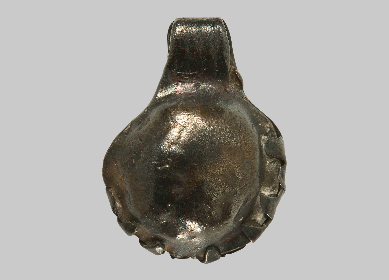 Bulla mit bandförmiger, gerillter Öse. Die umgebogenen Zacken sind noch zu einem Großteil erhalten. Im Inneren der Amulettkapsel ist noch ein nicht näher bestimmbarer Inhalt eingeschlossen (Knochenreste, Lorbeerblatt, Figürchen?).