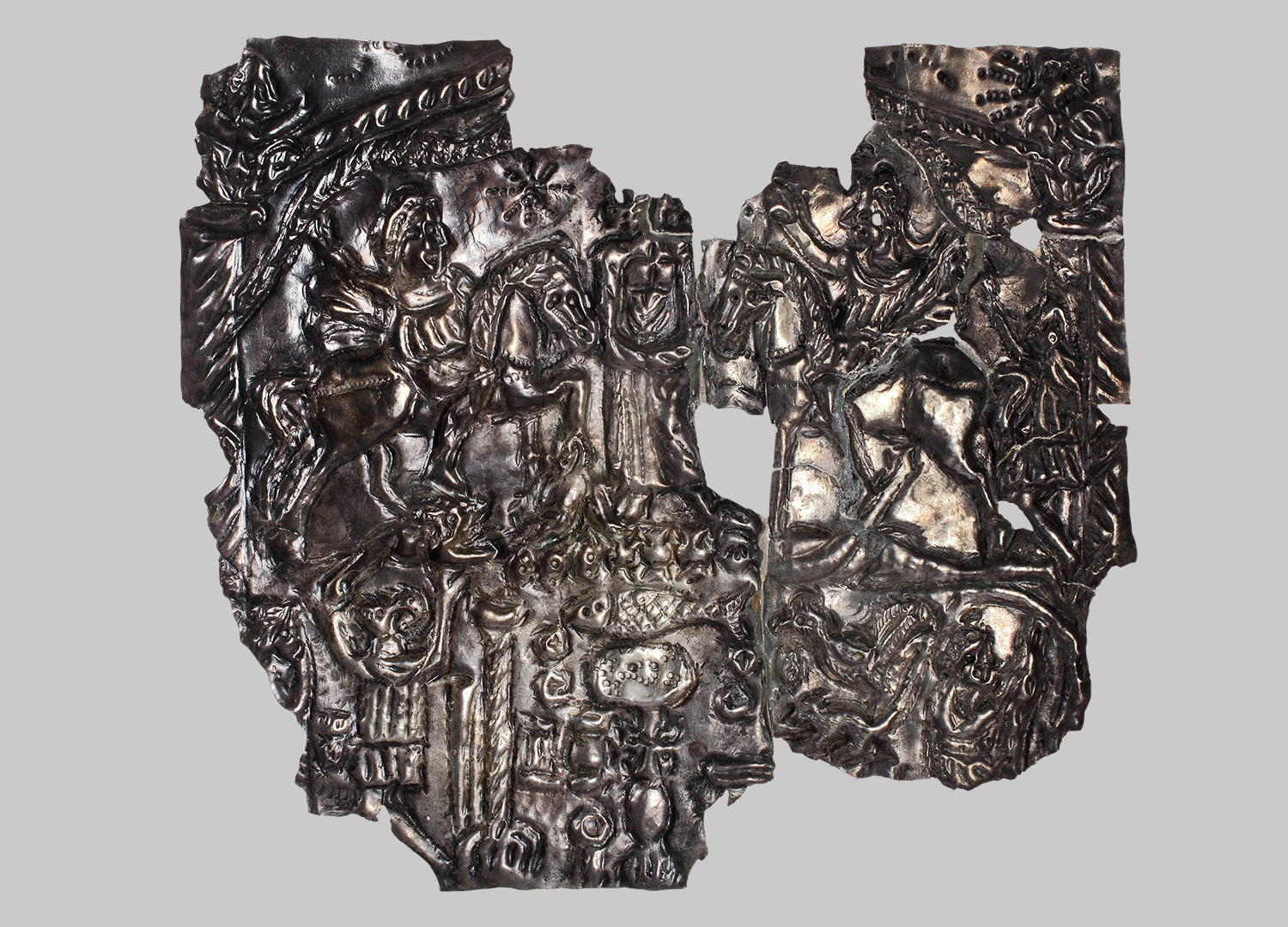 Innerhalb einer Aedicula sind in zwei Bildzonen figürliche und symbolhafte Darstellungen des Kultes der sog. Donaureiter angeordnet. In der oberen Zone die zentrale Göttin, flankiert von den beiden '' gekleideten Reitern. Das rechte Pferd steht auf einer liegenden nackten Figur mit am Rücken gefesselten Händen, hinter dem Reiter eine kleinere Figur in kurzer gegürteter Tunika mit gekreuzten Beinen. Unterhalb des linken Reiters befindet sich ein Fisch, der eine kleine menschliche Gestalt ausspuckt, links neben der Göttin ein Stern, darüber Reste der Drachenstandarten. In den Zwickeln oberhalb der Aedicula erkennt man die Büsten der Luna (links) und des Sol (rechts) sowie Reste von eingepunzten Buchstaben (?). Die Darstellungen des unteren Registers beziehen sich in detaillierter Weise auf verschiedene rituelle Vorgänge des Mysterienkultes, unter anderem auf einen Initiationsritus, bei dem eine Widdermaske getragen wird, und auf das Kultmahl des Fisches.