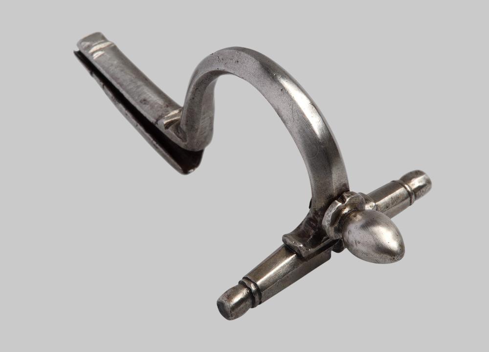 Scharnierarm mit seitlichen, durch zwei Rillen abgetrennten, schwach ausgebildeten Knöpfen. Halbkreisförmig gebogener Bügel mit eiförmigem Bügelknopf und flacher Scheibe. Der verbreiterte Kopfteil des Bügels sitzt auf dem Scharnierarm auf. Röhrenförmiger Fuß, auf der Oberseite mit Querleisten verziert. Die Nadel fehlt.