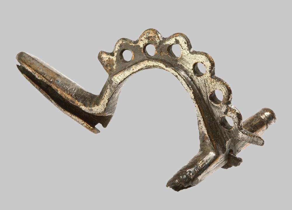 Der halbkreisförmig gebogene hohe Bügel wird durch einen durchbrochenen Kamm betont. Nadel fehlt.