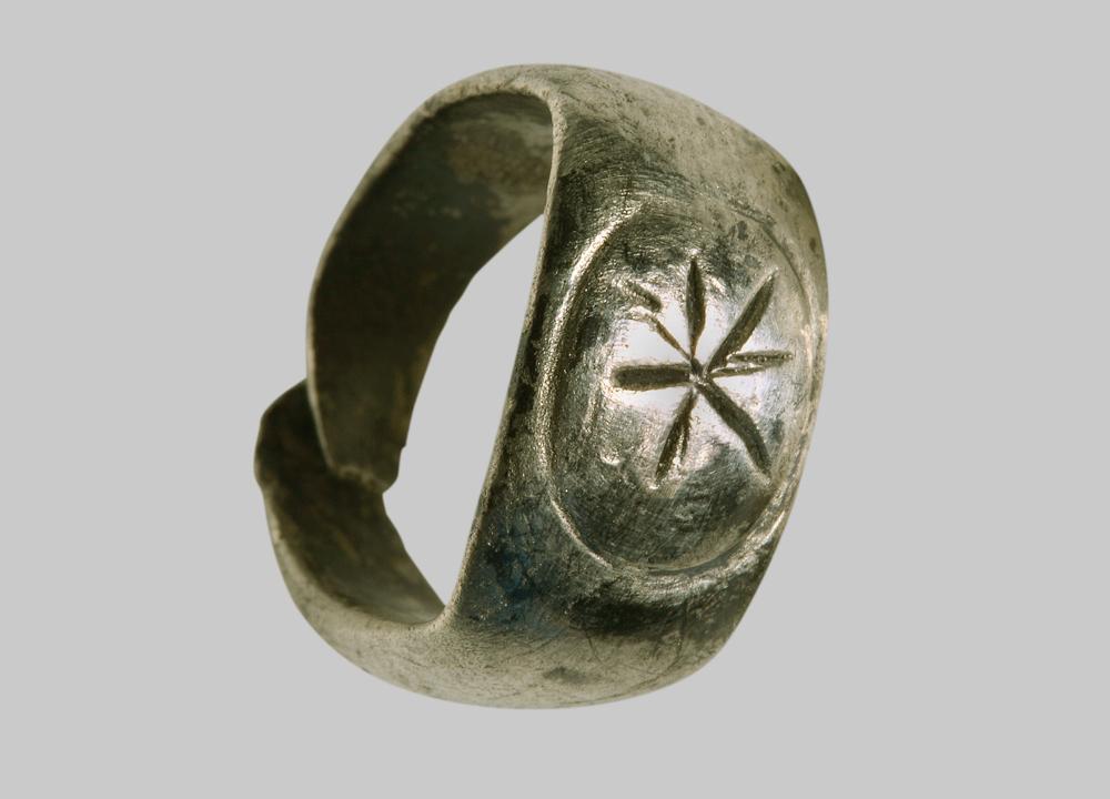 Bandförmiger Reif, der sich nach oben zur Vorderseite verbreitert. In der Mitte des Reifs befindet sich eine runde Ringplatte (0,7 x 0,95 cm) mit eingeritztem achtstrahligem Stern. Der Reif ist im unteren Teil gebrochen.