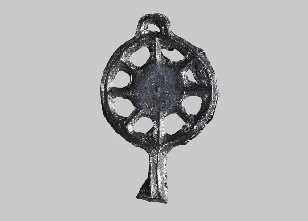Votiv in Spiegelform; in der Mitte volle Scheibe mit Noppe; Rand radförmig mit 8 Speichen, Zwischenräume durchbrochen; oben Öse; unten Griff, nach unten breiter werdend.