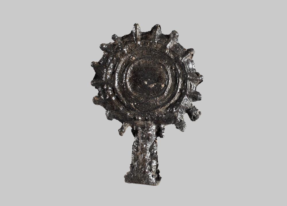 Votiv in Spiegelform; drei konzentrische Kreise mit radial angeordneten Zacken; Griff nach unten hin breiter werdend und mit Noppen bedeckt.