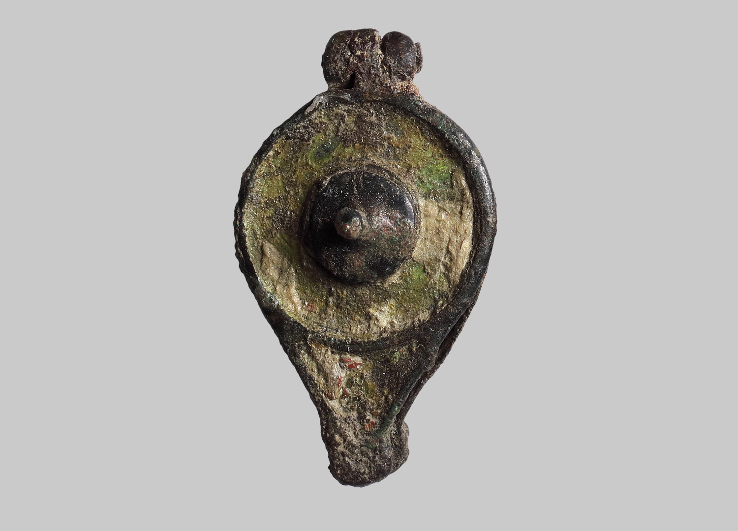 Blattförmig. Auf der Deckeloberseite eine kreisrunde sowie eine dreieckige Vertiefung mit Emailresten (weiß, grün, rot). Im Zentrum eine kegelförmige Aufwölbung.