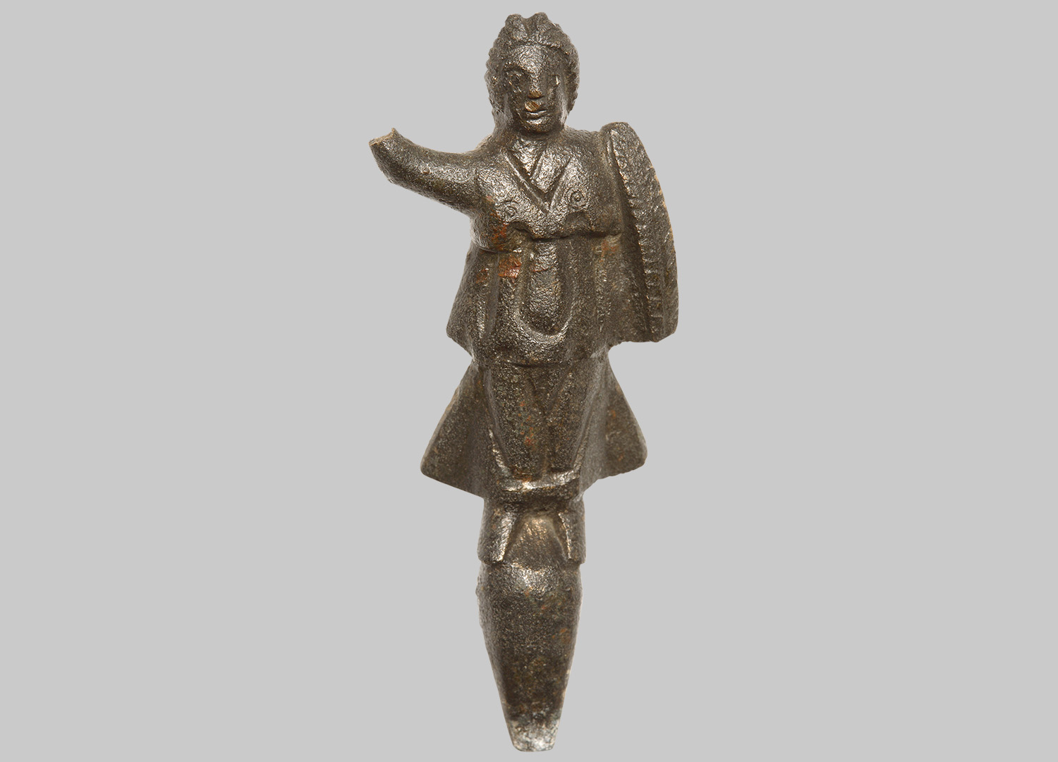 Statuette einer Victoria, die mit leicht geöffneten Beinen auf einem kleinen Globus steht. Der zapfenförmige Fortsatz lässt erkennen, dass sie als Aufsatz (vielleicht eines Dreieckvotivs des Dolichenuskultes?) diente. Die Göttin trägt einen gegürteten Chiton mit Überschlag. Im linken Arm hält sie einen Palmzweig, in der hochgestreckten Rechten einen Kranz.
