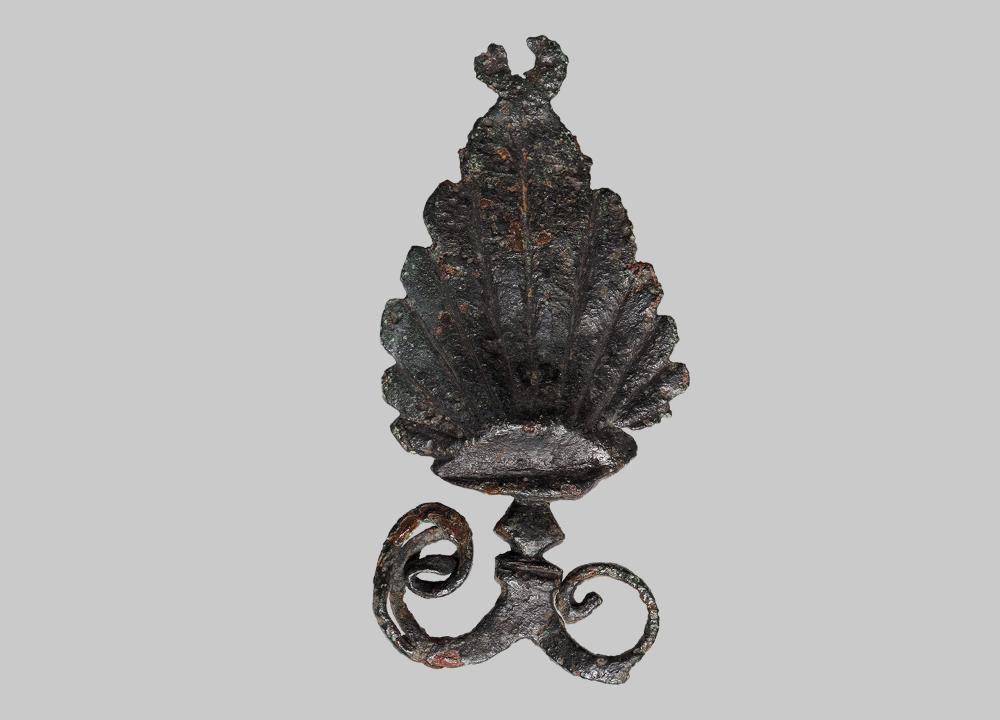 Zierpalmette aus Bronzeblech. Das Nietloch im Fortsatz auf der Palmettenspitze ist ausgebrochen. Derartig gestaltete Zierpalmetten waren bei Schwertern vom Typ Pompeji im Bereich der Schwertspitze, direkt über dem V-förmigen Rahmenortband angebracht.