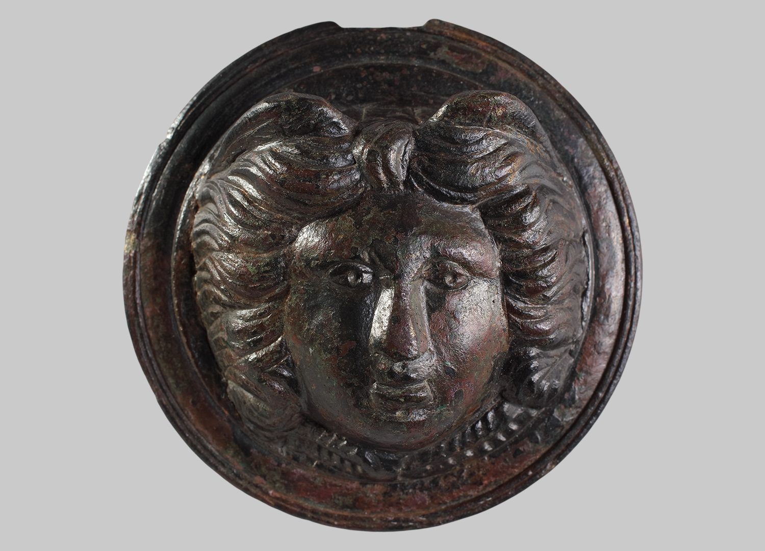 Medusenhaupt mit Flügelpaar und ohne Schlangen im Haar. Unter dem Kinn zwei gekerbte Bänder. Gerillter Rand. Die rechteckige Befestigungsöse am oberen Rand ist ausgebrochen.
