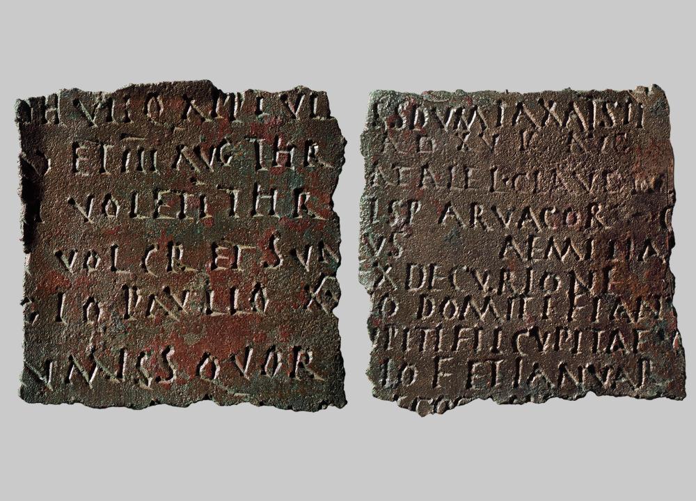 [Imp(erator) Caes(ar) divi Hadriani f(ilius) divi Traiani Parthici nep(os) divi Nervae pronep(os) T(itus) Aelius Hadrianus Antoninus Aug(ustus) Pius pontif(ex) max(imus) trib(unicia) pot(estate) II co(n)s(ul) II p(ater) p(atriae) peditibus et equitibus qui milit(averunt) in alis IV et c]oh(ortibus) VII q(uae) app(ellantur) (1) I Ulp(ia) [cont(ariorum (miliaria) et (2) - - - et (3) I Hispan(orum) Arvac]o(rum) et (4) III Aug(usta) Thr[ac(um) et (1) ? I Aelia (miliaria) sag(ittaria) et (2) ? II Alpinor(um) et (3) II]II vol(untariorum) et (4) I Thr(acum) [c(ivium) R(omanorum) et (5) ? V Call(aecorum) Lucens(ium) et (6) ? I Ulp(ia) Pan(noniorum) (miliaria) et (7) XVII]I vol(untariorum) c(ivium) R(omanorum) et sun[t in Pannonia superiore sub Ser]gio Paullo XX[V pluribusve stip(endiis) emer(itis) dimiss(is) ho]n(esta) miss(ione) quor[um nomina subscr(ipta) sunt ipsis liberis posterisq(ue) eorum civitatem dedit et conubium cum uxoribus quas tunc habuissent cum est civitas iis data aut si]q[ui caelibes essent cum iis quas postea duxi]ss(ent), dumtaxat sin[guli singulas]. A(nte) d(iem) XV K(alendas) Aug(ustas) [L(ucio) Minicio N]atale L(ucio) Claudio P[roculo] [alae I H]isp(aniorum) Arvacor(um) c[ui praeest] [ - - -]us Aemilian[us] ex decurione [- - -]io Domiti f(ilio) Ianu[ario], [- - - C]upiti fil(iae) Cupitae ux(ori), [- - -]io f(ilio) et Ianuari[o/-ae f(ilio/-ae)] [descript(um) et r]ecog(nitum) [e]x [tabula aerea quae fixa est Romae in muro post templum divi Aug(usti) ad Minervam]. (Komposittext aus Innen- und Außenseite)
