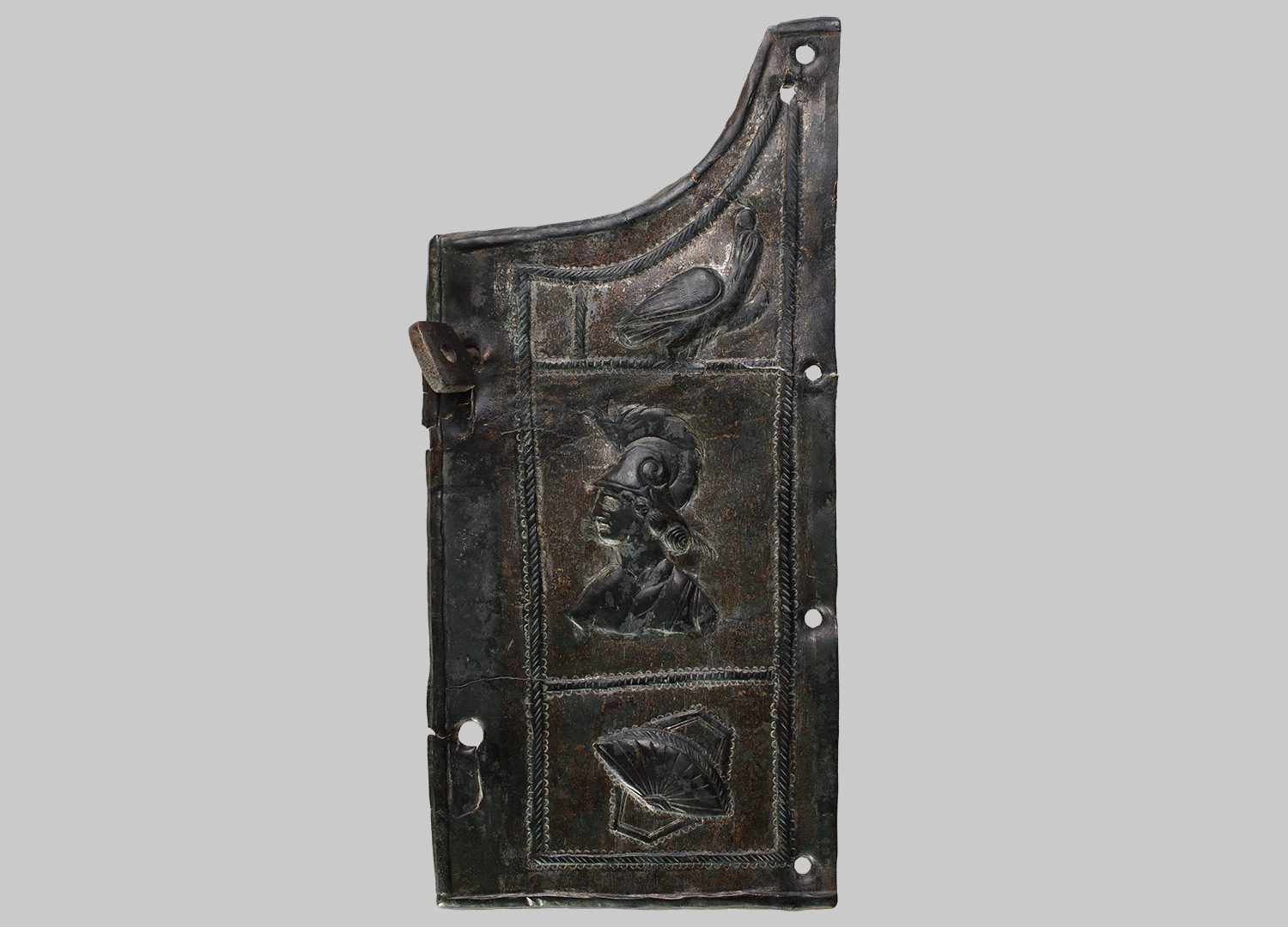 Linke Platte eines zweiteiligen Panzerverschlussblechs von einem Schuppenpanzer. Drei Bildfelder sind von einem Schnurstabrahmen eingefasst. Im oberen Bildfeld, das dem gerundeten Abschluss des Blechs für die Halspartie folgt, ist ein Adler nach rechts mit nach oben gewandtem Kopf dargestellt. Das mittlere Bildfeld zeigt eine Marsbüste mit korinthischem Helm und Schultermantel, das untere zwei gekreuzte Schilde, einen Rundschild über einem sechseckigen Polygonalschild. Links zwei geschlitzte Knebellöcher. Im oberen Schlitz hat sich einer der Knebel erhalten, durch welche der Verschluss der paarweise getragenen Bleche erfolgte. Vier Nietlöcher am äußeren rechten Rand zeugen von der Befestigung der Platte am Panzer.