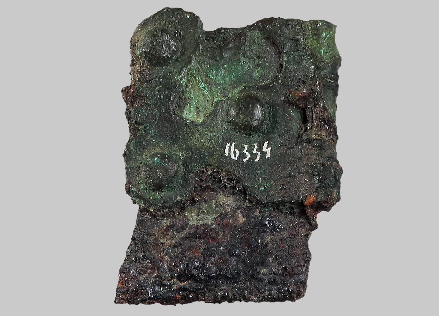Palmettenförmig. Drei Nieten sind erhalten. Ursprünglich auf einer eisernen Panzerschiene montiert. Reste davon sind noch erhalten. Palmettenförmige Schulterscharniere sind typisch für den Schienenpanzer vom Typ Corbridge.
