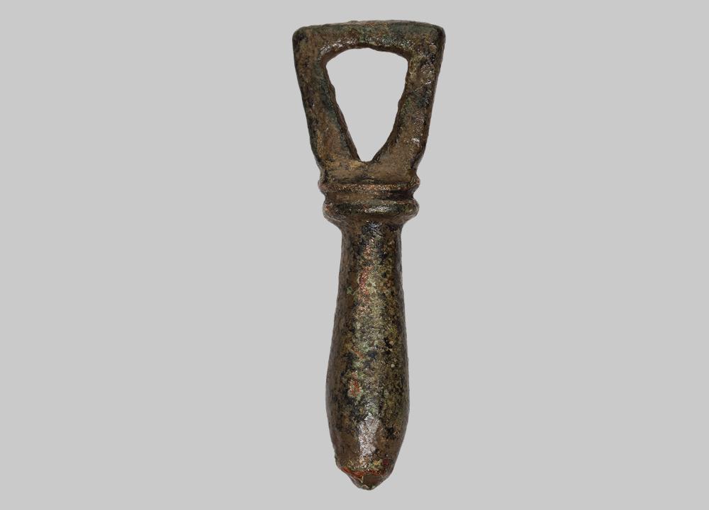 Vollplastischer keulenförmiger Anhänger mit dreieckig geformter Öse.
