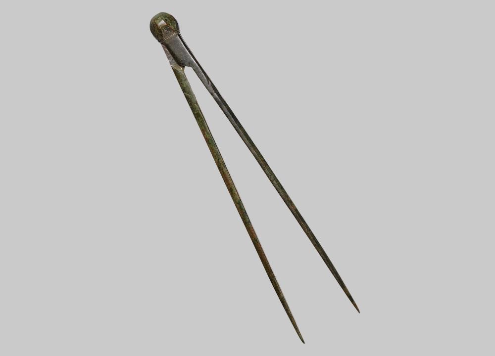 Zwei glatte Schenkel mit Erweiterung im oberen Bereich. Knopfartiger Abschluss.