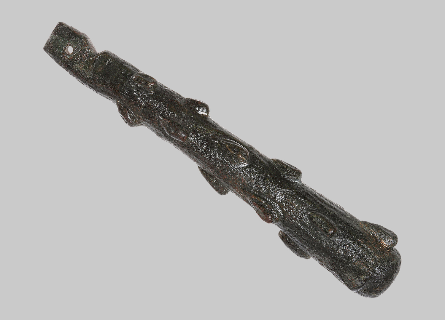 Massives, gegossenes Stück. Die tropfenförmigen Erhebungen, die auf der gesamten Oberfläche angebracht sind, imitieren die Astnarben einer hölzernen Keule. Das obere, spitz zulaufende Ende der Keule weist eine seitliche Einkerbung auf und ist einfach gelocht. Möglicherweise als Anhänger verwendet oder als Attribut einer bronzenen Herkulesstatuette.