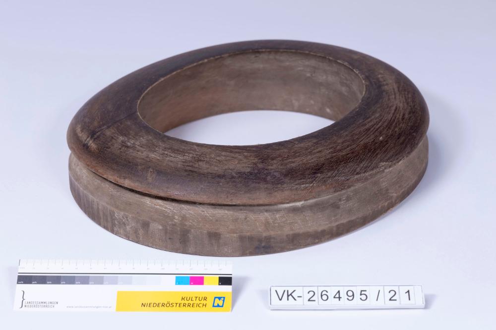 Holzform für eine Hutkrempe, Reste einer Lackierung, Model (positiv), vermutlich Teil einer mehrteiligen Hutform, gravierte Aufschrift "57"