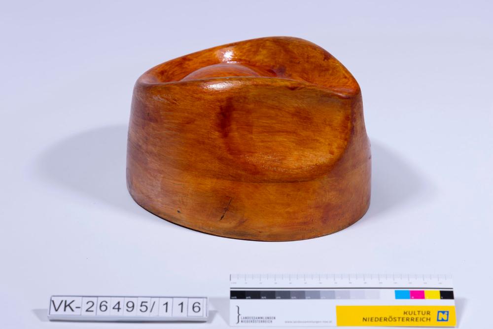 Holzform lackiert, Model (positiv) mit drei großen (2,9 cm) Löchern an der Unterseite zur Befestigung in einer Drehmaschine. Eingravierte Nummer: "57" und Graphitmarkierung: "Kreuz" an der Unterseite.