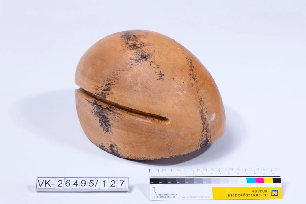 Holzform mit Resten einer Lackierung, Model (positiv) mit einem großen Loch (3,6 cm) an der Unterseite zur Befestigung in einer Drehmaschine. Markierungen mit Graphit und blauem Stift an der Unterseite (Mittellinie).