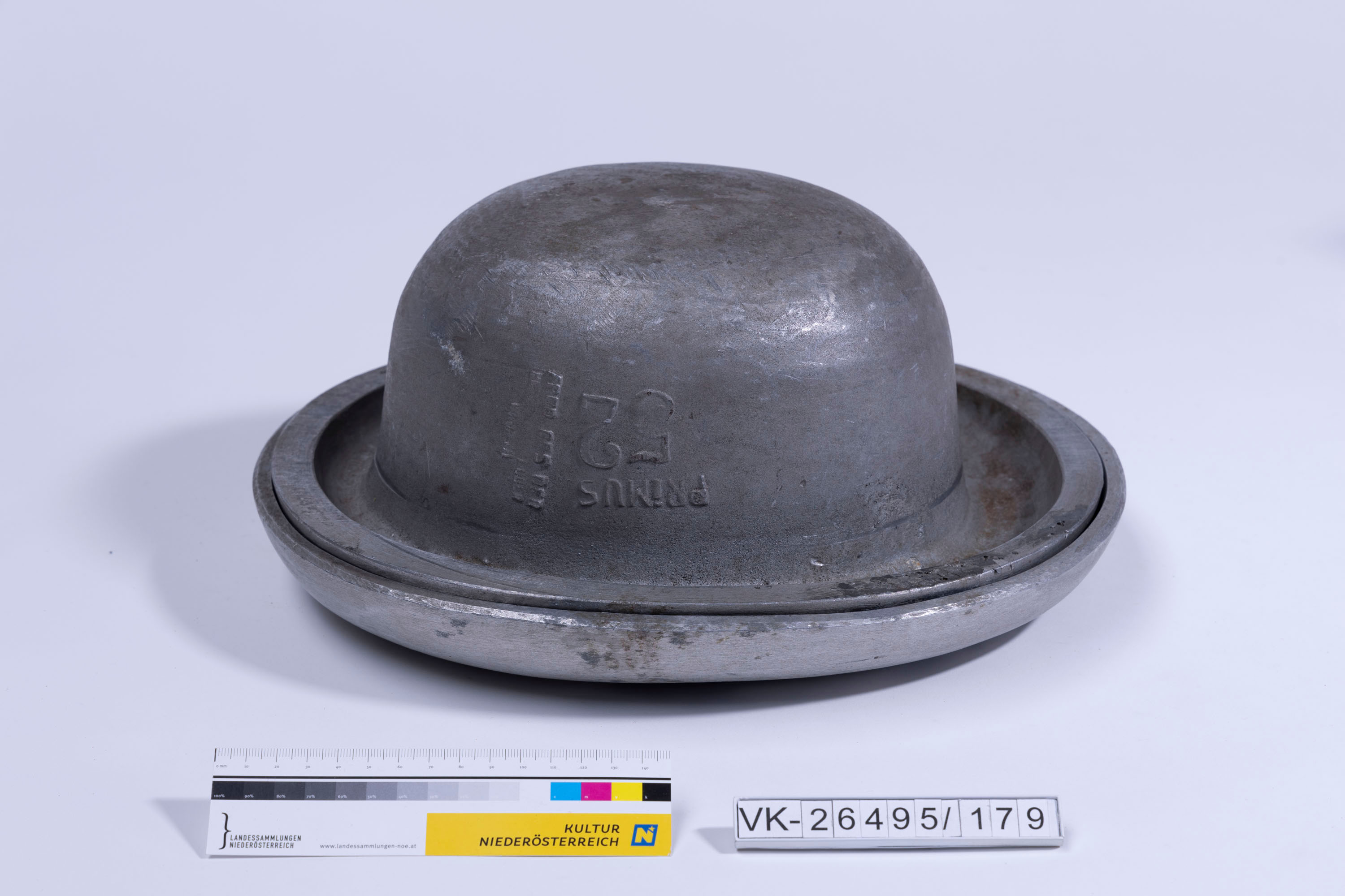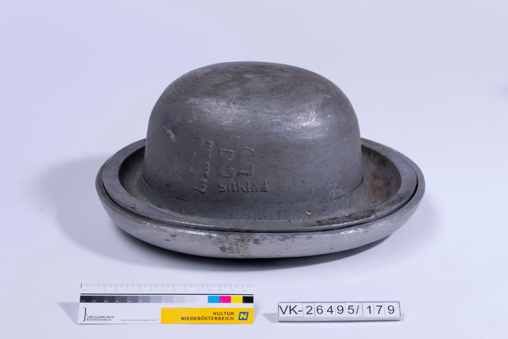 2-teilige Hutform aus Gusseisen (negativ, kompletter Hut mit Krempe), im Guss integrierte Beschriftung: "Primus 52 PROD. GES. DER HUTFORMERZEUGER WIEN VII" sowie eingravierte Nr.: "52" auf beiden Teilen