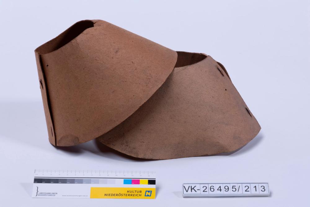 zwei konische Formen aus braunem Karton, dienen vermutlich der Vorarbeit zur Huterzeugung, mit jeweils zwei Klammern zusammengehalten, bei einer der Formen Verbindung offen