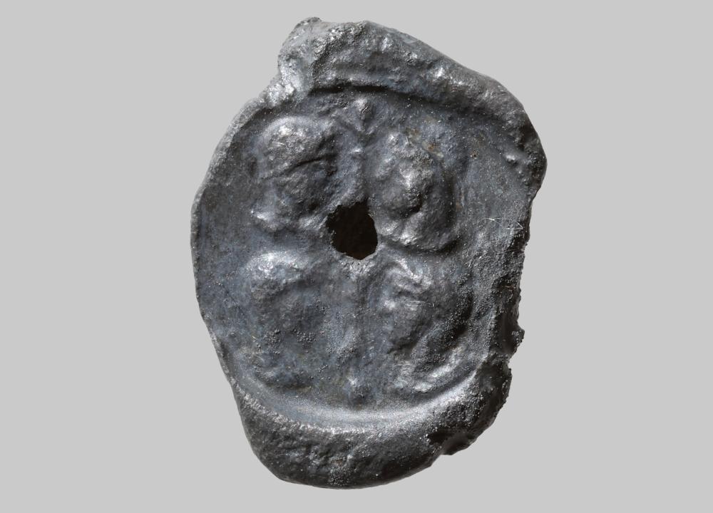 Unförmige Plombe mit rundem Stempel; vier männliche Köpfe im Profil, zueinander schauend, je zwei Kopfpaare übereinander; Köpfe bekränzt; zwischen Kopfpaaren jeweils eine Victoria; Portraits der Tetrarchen im Zuge der Kaiserkonferenz in Carnuntum im Jahr 308 n. Chr.; hinten senkrechte Durchlochung