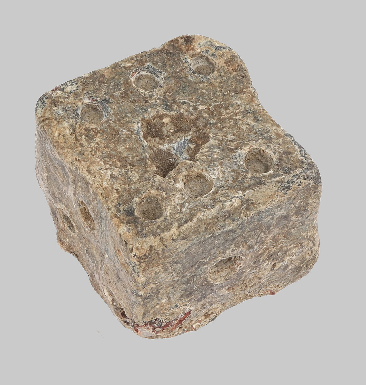 Ein quadratischer Würfel mit eingetieften, kreisrunden Punktaugen zeigt zweimal die Eins sowie je einmal die Zwei, Drei, Vier und Sechs. Die Fünf fehlt.