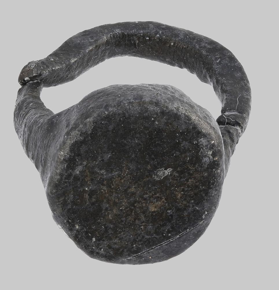 Ein Fingerring mit dickem, rundem Ringkopf. In den Ringkopf sind zwei Buchstaben in Schreibschrift kaum sichtbar eingeritzt.