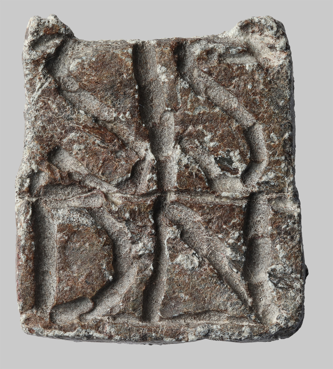 Quadratisches, flaches Gewicht aus der Münzstätte Siscia mit eingeritzten Buchstaben auf Vorderseite. Die Buchstaben sind in kleinen Zügen zweireihig eingemeißelt. Die erste Zeile enthält drei Buchstaben "SIS" und die zweite Zeile die Buchstaben DN. Dies ist die Abkürzung für "Siscia Domini Nostri". Auf der Oberseite sind Ansätze von Schlaufen erhalten.