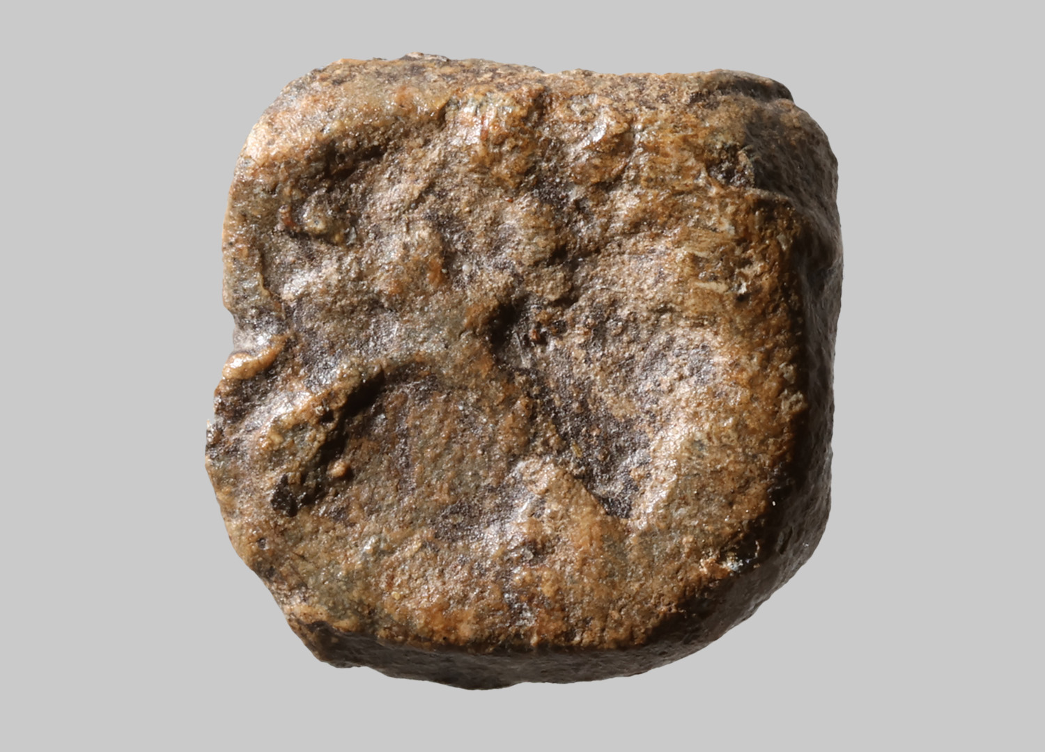Quadratische, flache Marke mit rundem Stempel; Buchstabe V oder X