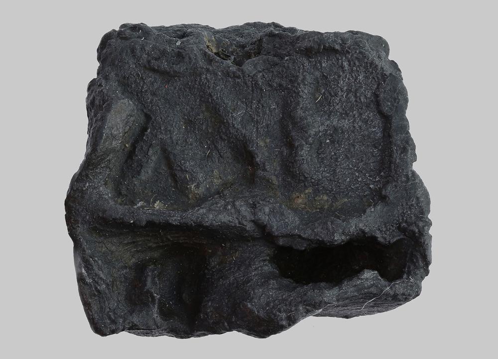 Rechteckige Plombe mit rechteckigem Stempel; Buchstaben ME für Metalla; hinten senkrechte Durchlochung; innen teilweise hohl.