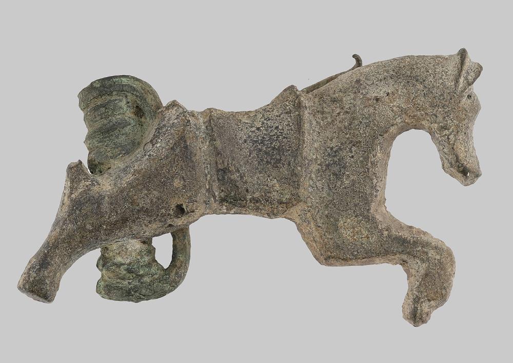 Pferdeförmige Fibel; Pferd nach rechts galoppierend, mit Sattel; Nadel und Spule aus Bronze